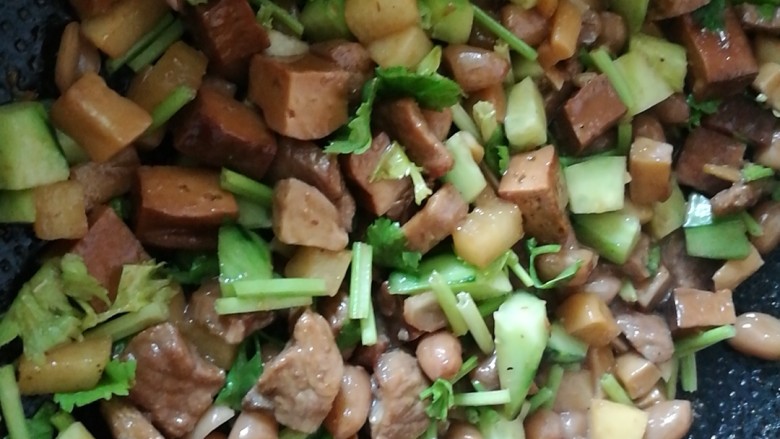 10. 倒入豆干翻炒,倒入提前用高压锅炖熟的花生翻炒