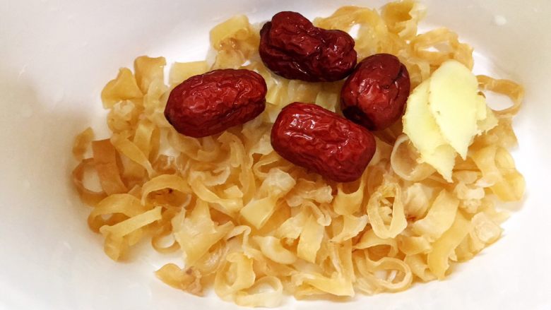 5. 凉透的花胶再用纯净水加姜片泡发18个小时