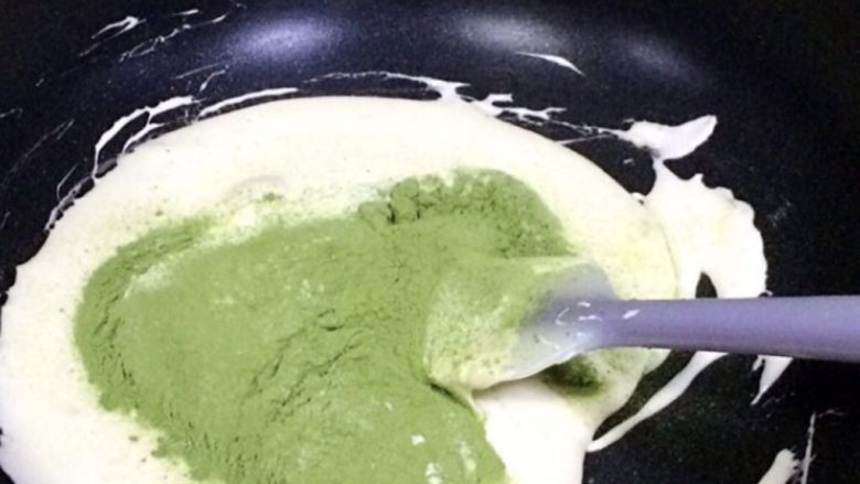 4. 奶粉和抹茶粉混合后放入棉花糖液体中,搅拌均匀。