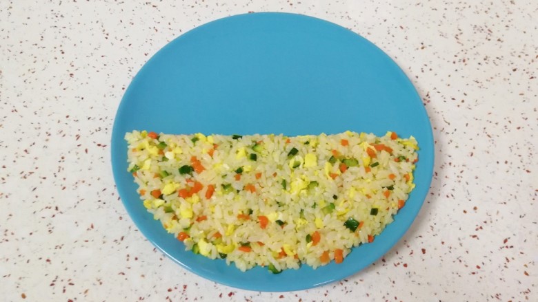17. 取一个盘子,从中间的二分之一处铺上炒饭,用勺子把边缘压整齐。
