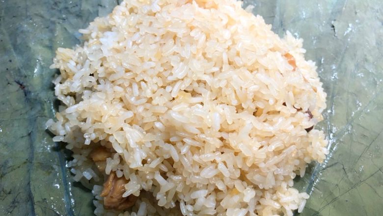 9. 糯米泡好沥干水,放入10g油,3g盐,30g生抽搅拌均匀