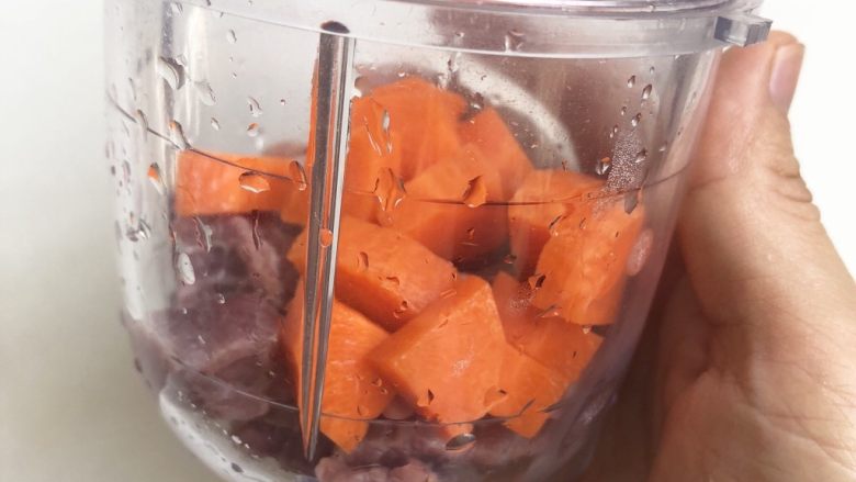 6. 玉米细末、牛肉胡萝卜泥、熟米饭倒入干净的碗里,加入少许虾皮粉