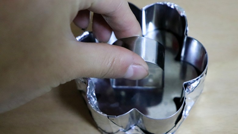 1. 慕斯圈用锡纸包裹住一端,用皮筋固定,作为慕斯的底。