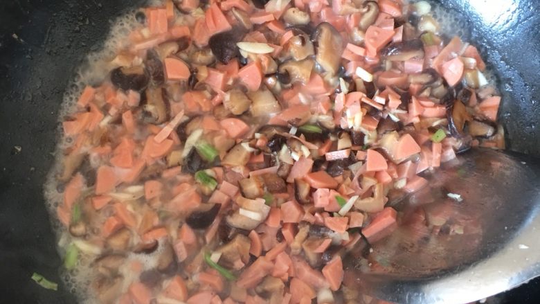 1. 准备酱料配菜:香菇温水泡一小时,切成丁;3块蒜瓣切成蒜蓉。