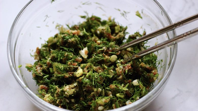 5. 用刀把洗净的茴香切碎、把小香葱也切碎备用;