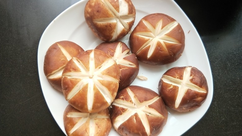 12. 每一个香菇都放一点淀粉,再用清水抹一下。