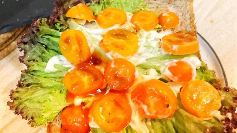 13. 剩下的两个圣女果切片,摆上后抹上番茄酱和沙拉酱。