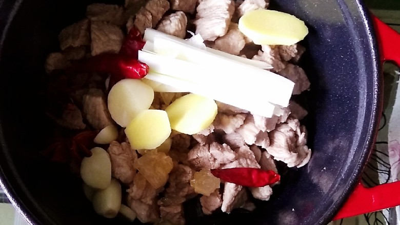 5. 铸铁锅开小火,加少许油,放入肉块煸炒,炒至猪肉微微发黄,放入姜片,葱,冰糖,干辣椒和蒜片煸炒