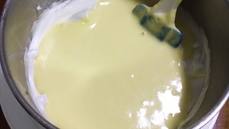 10. 取三分之一的蛋白霜加入到蛋黄糊中。