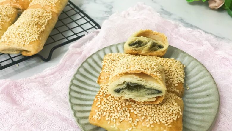13. 用擀面杖擀成稍长一点的面皮,表面撒上黑芝麻白砂糖碎。