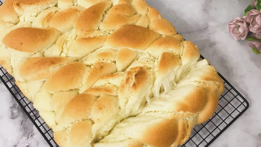 16. 取一个面团用手按压再擀成长舌形,用括板切成三条,一头不要切断。编辫子那样编好。