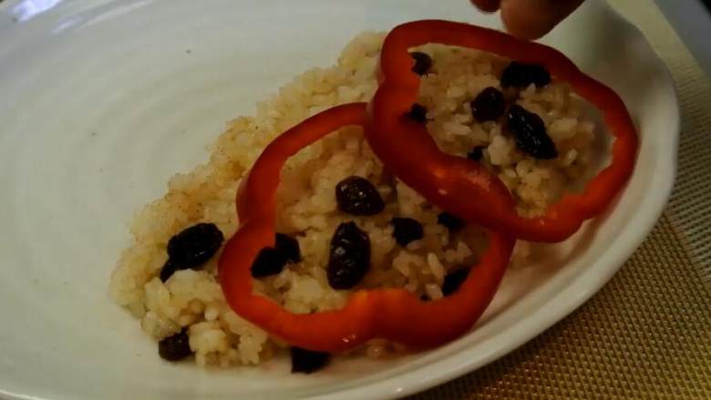 9. 翻炒好的米饭盛出,切几片圆椒装饰