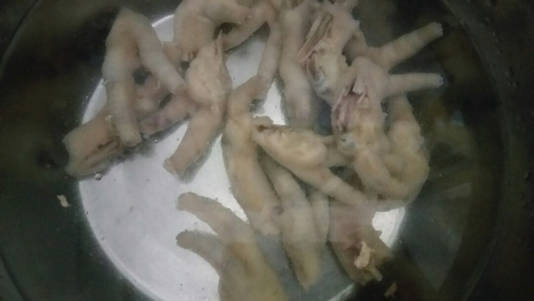 3. 大火煮15分钟左右,确保鸡爪煮熟,捞出用冷水冲掉浮沫,直至鸡爪完全降温。