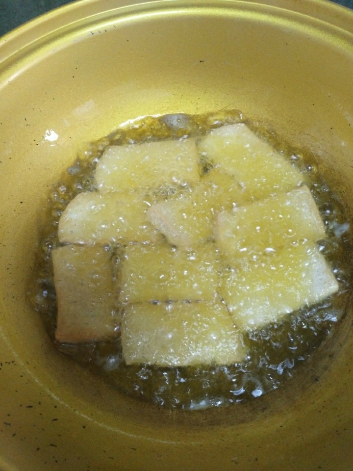 11. 将控干的豆腐再放入锅中炸至金黄,捞出控油