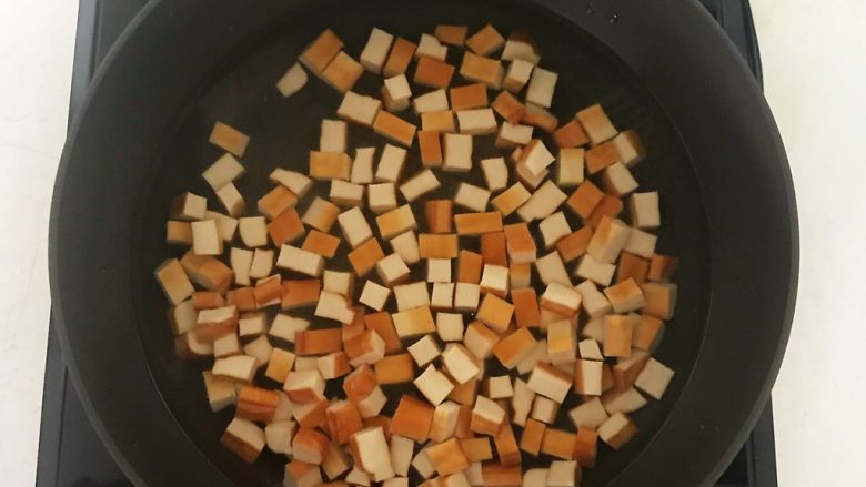 10. 锅里加入冷水烧开后加入豆干,焯水2分钟,捞出来沥干水分,备用