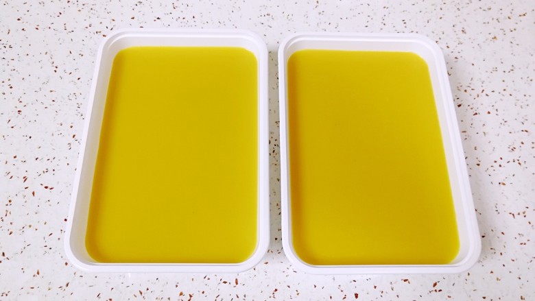 9. 准备好一次性饭盒,先倒入晾好的原味肉皮汤,放入冰箱冷藏凝固(注意倒一半就可以,上面倒蔬菜肉皮汤),再倒入晾好的胡萝卜肉皮汤至九分满,彻底凉透以后盖上盖子放入冰箱冷藏,一个小时左右就凝固了。最好冷藏一夜再吃,更加Q弹。