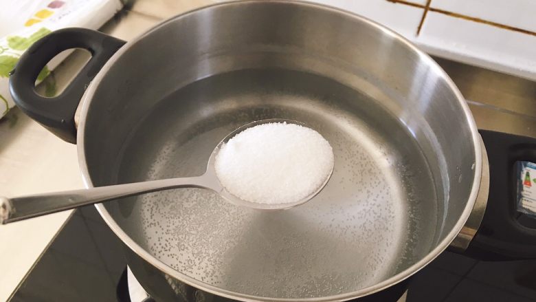 2. 锅内倒适量水,加1匙盐,大火烧开