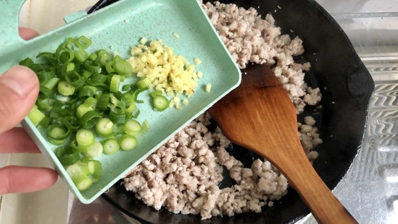 12. 小火把肉末炒散,炒到肉末发白出油,加入姜末葱白,煸香
