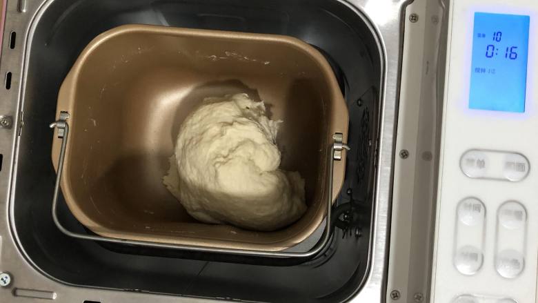 3. 面团材料中黄油以外的所有食材(包括做好的烫种)混合,揉成光滑的面团。 面团揉至粗膜状态加入黄油继续揉至完全阶段