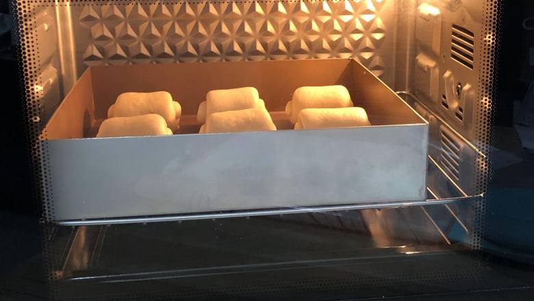 10. 放进烤箱调至发酵区,放一杯温水,发酵至1.5-2倍大 发酵好的面包拿出