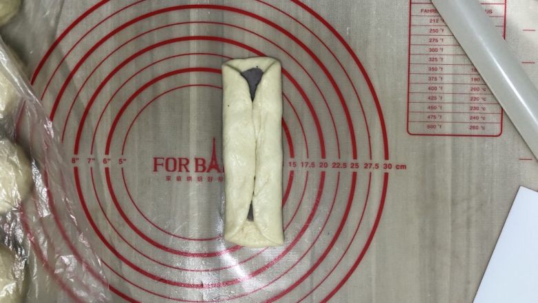 9. 从上向下卷,收口处捏紧收口处朝下 以免发酵时收口处爆开