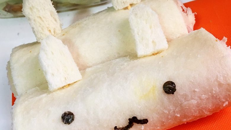 9. 接下来做兔子耳朵,去边的吐司用剪刀剪出一个薄片