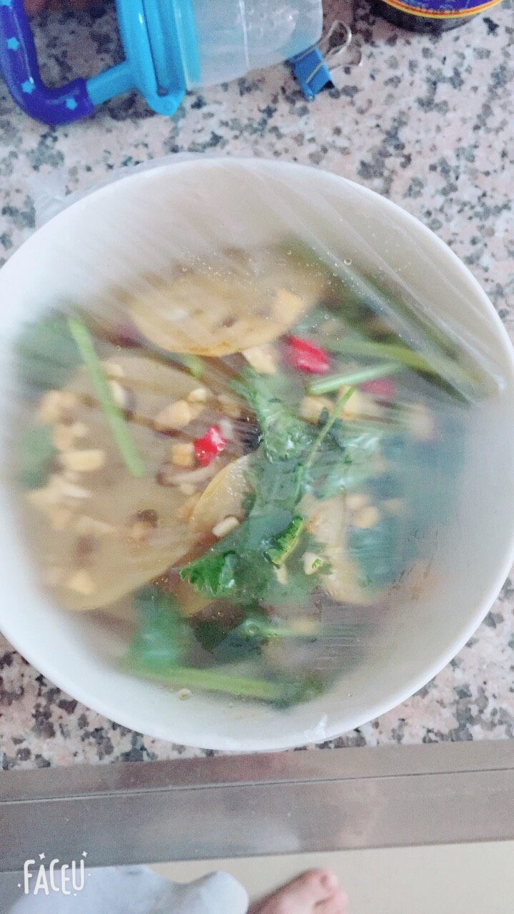 1. 莲藕切片水滚烫好,蒜头,子天椒,香菜,切好如图