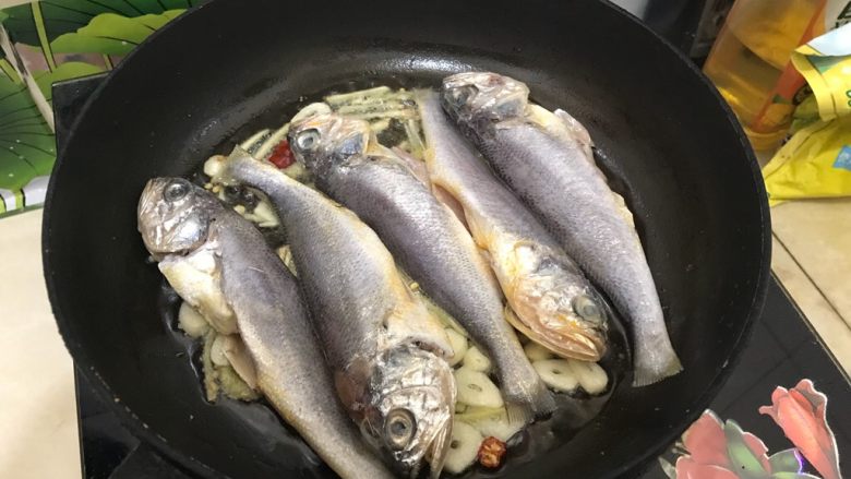 10. 放入小黄鱼,小火慢煎