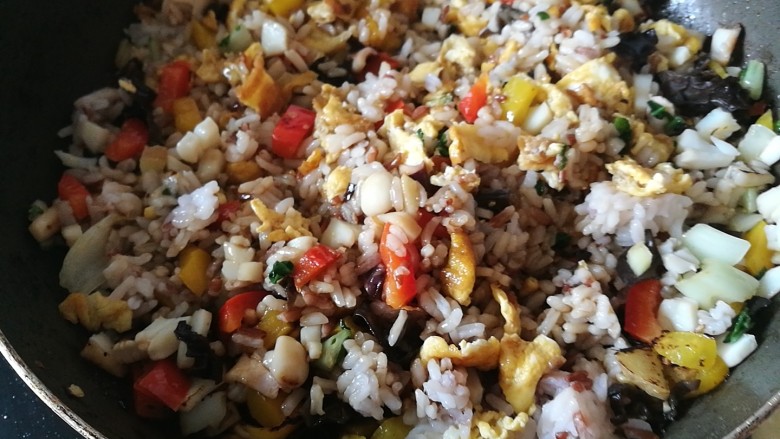 炒饭是我们家最爱 每有剩饭 就收罗现有的各种材料来炒饭 这回用剩下杂粮米饭 加上彩椒蔬菜黑木耳 香喷喷的炒鸡蛋和鱿鱼 做一碗五彩缤纷营养丰富的炒饭