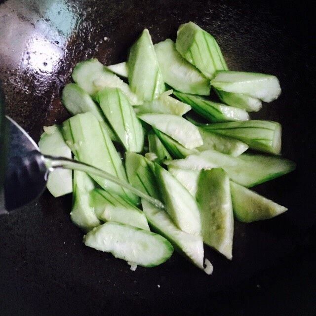14. 翻炒片刻后加入适量的热水,炒熟即可。炒丝瓜过程中不要盖锅盖