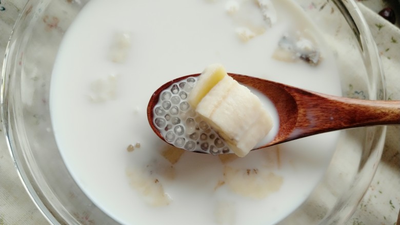 - ①、牛奶、香蕉提前放冰箱冷藏,西米煮好直接把牛奶倒进去,放入切好的香蕉,搅拌均匀就可以喝了,冰冰凉凉,特别适合夏天。也可以把做好的西米露直接放冰箱冷藏10分钟左右在端出来喝。不喜欢喝冷的西米露可以把牛奶加热。