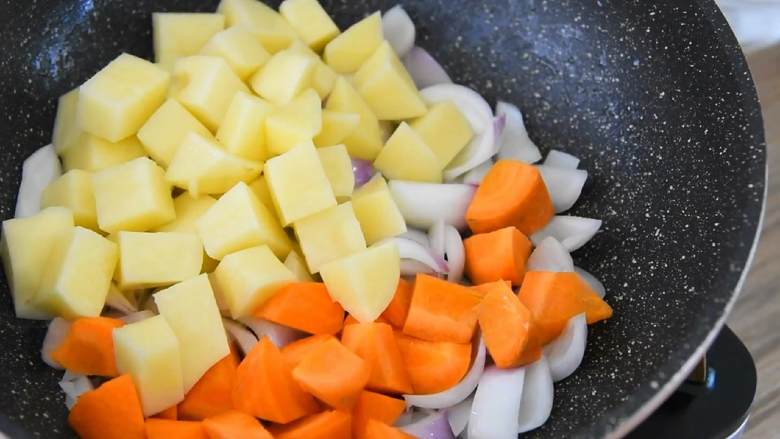 6. 再倒入胡萝卜、土豆,大火炒至断生