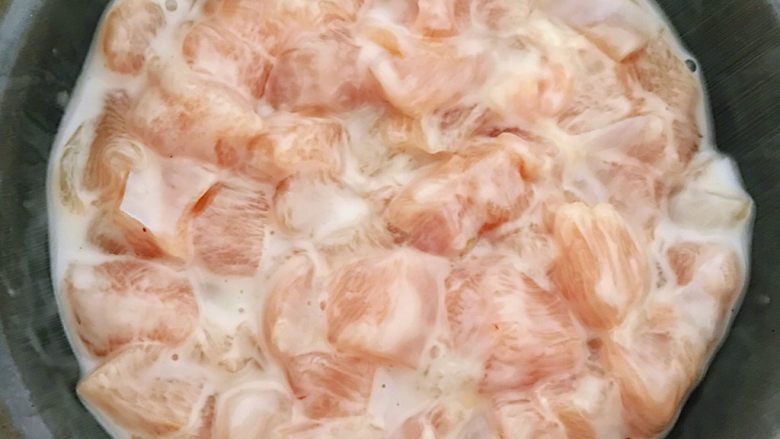 3. 鸡胸脯肉丁均匀的裹上淀粉糊