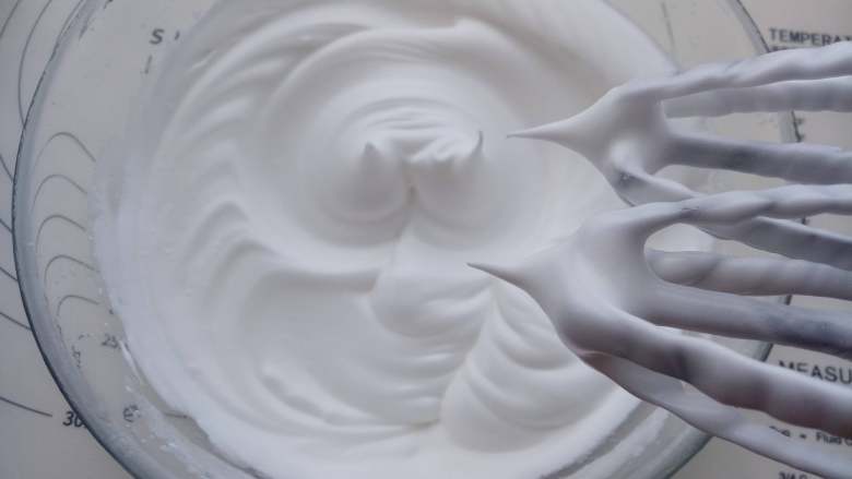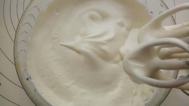 2. 蛋清加几滴白醋分三次加糖打到尖角。