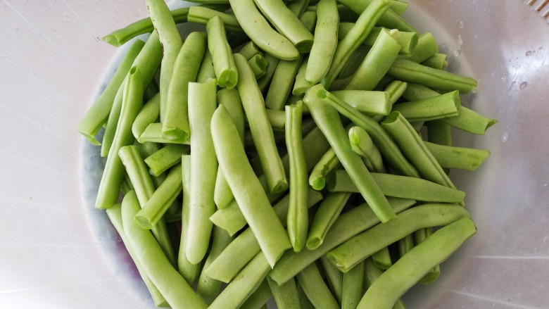 8. 四季豆煸炒至表皮起皱,锅里留底油,舀出四季豆备用。