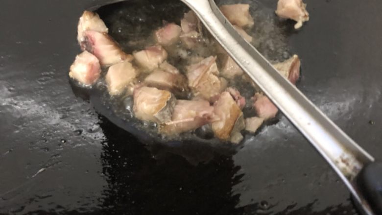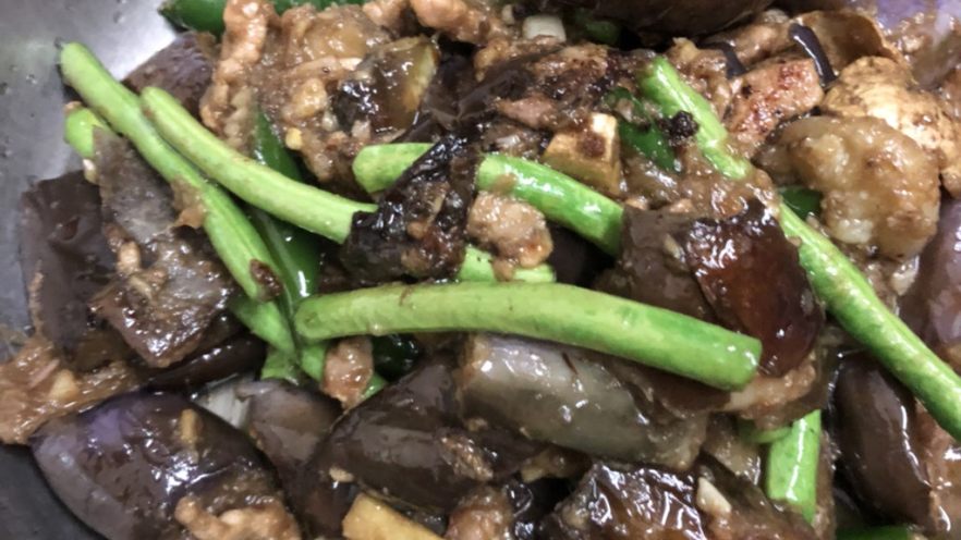 8. 咸鱼爆香后茄子肉丝一起放进去、焖大该10分钟小火、可以再加点油油量够就不用加,因为茄子比较吸油