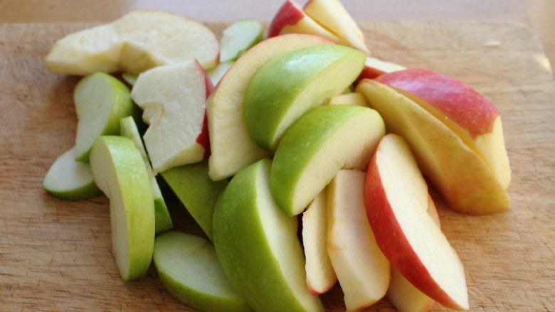 6. 在烤的同时,我们将苹果洗净、去核、切成船形,挤点柠檬汁。 注:这里柠檬汁的作用是防氧化,增味。