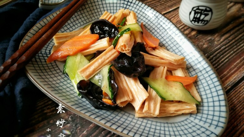 2. 干腐竹提前3-5小时用冷水泡软,图中是已经泡发好的状态。因为干的腐竹很轻,泡的时候总是会有一小部分浮在水面上泡不到,可以在泡的时候上面再压一个瓷盘子,这样能保证腐竹全部浸在水中,让腐竹很好的泡发,用手捏捏完全没有硬心了就可以了。