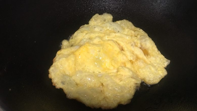 5. 热锅加油,大火烧热油倒入鹅蛋液,炒熟成蛋皮。