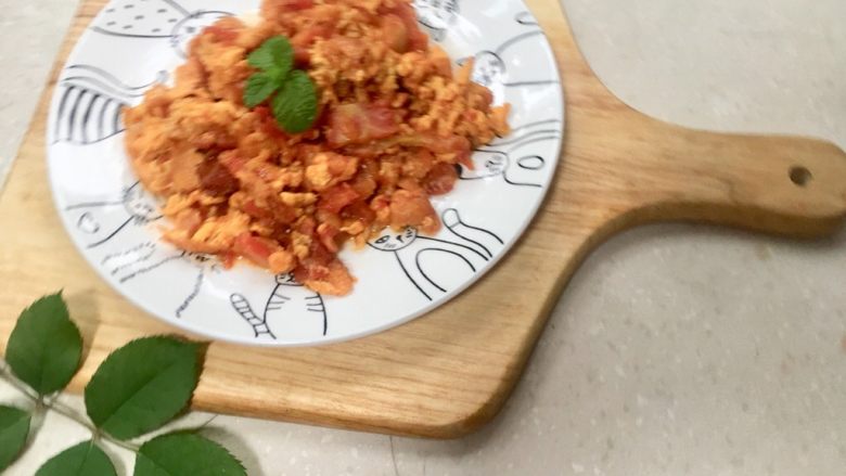 6. 蛋皮铲在边上,倒入番茄翻炒均匀,炒出番茄汁最好。
