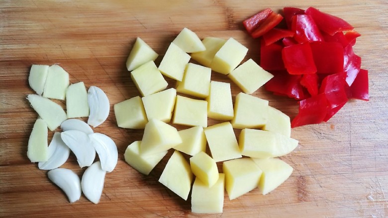 2. 土豆和红椒切成小块,姜和蒜切成片备用。