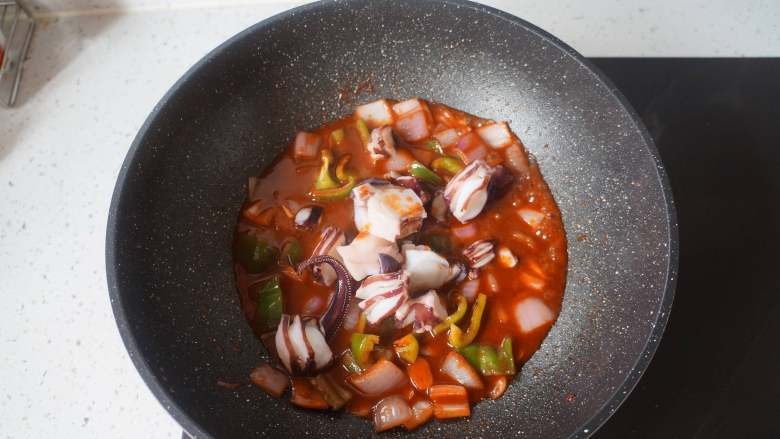 10. 汤汁熬到有些粘稠时放入章鱼足和青椒片拌匀就可以了