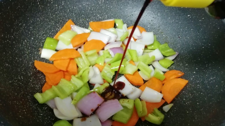 9. 锅底留余油,下入胡萝卜洋葱青椒片翻炒均匀。