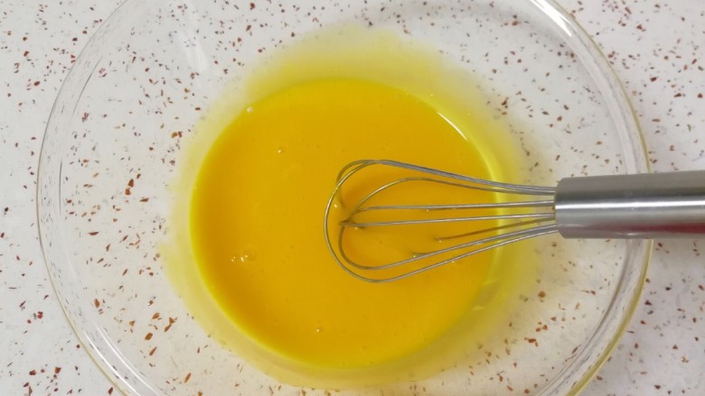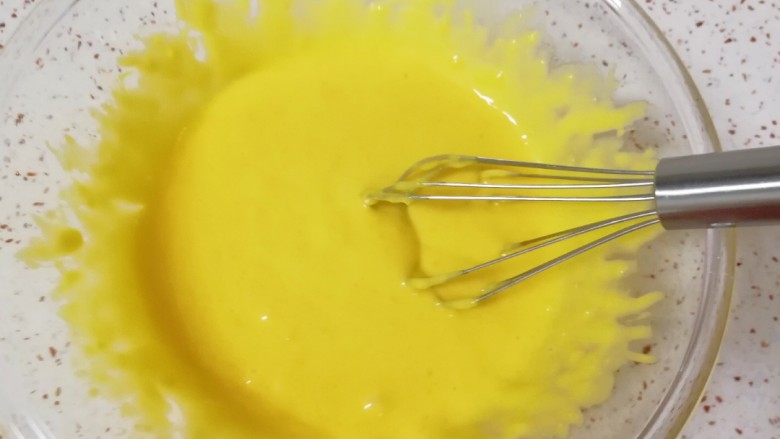 4. 搅打至蛋黄、牛奶和玉米油完全融合。