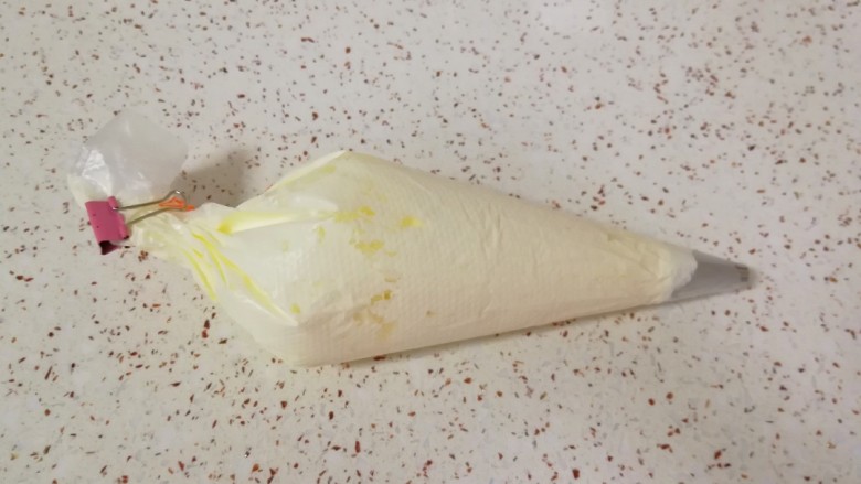 25. 裱花袋底部剪一个口,装入圆孔裱花嘴,然后把奶油装入裱花袋,用夹子夹上。