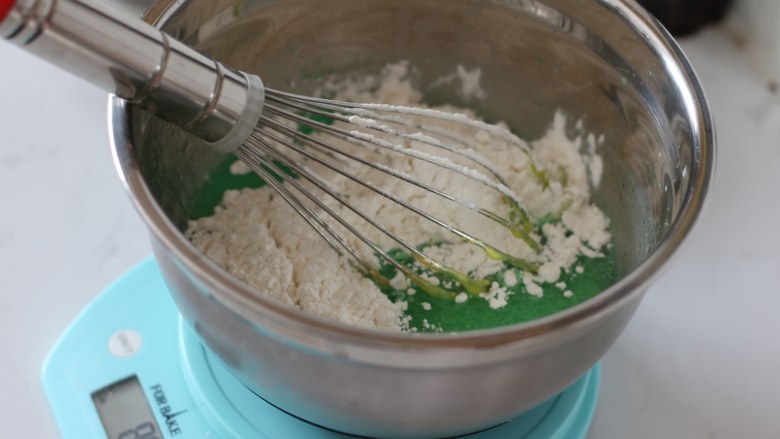 2. 筛入低粉a,用蛋抽“之”字形拌匀至看不到干粉。(我做的是两个的量,所以看起来会比较浓稠)
