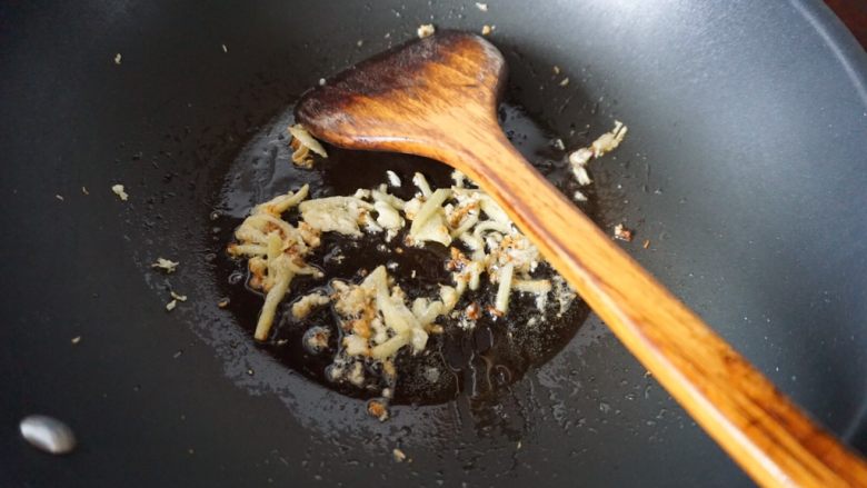 4. 锅里热油后放入姜丝和压入蒜泥煸香
