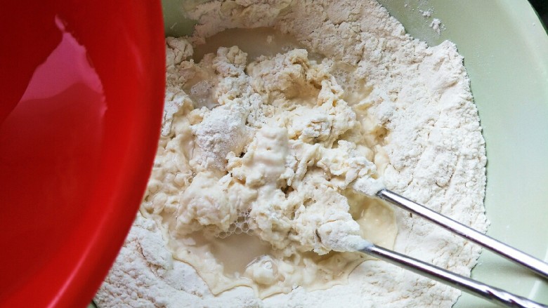 10. 一边慢慢的把水倒入面粉里(注意一点一点的倒)一边用筷子搅动