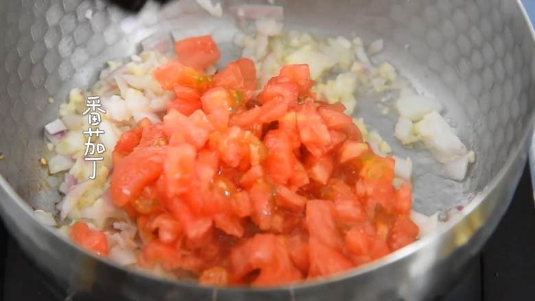 10. 倒入番茄丁,翻炒至番茄出沙。