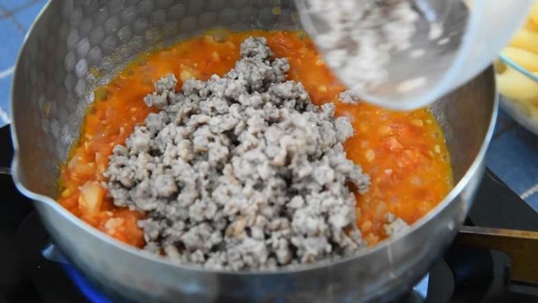 8. 融化黄油。 倒入肉糜,炒至变色后盛出备用。